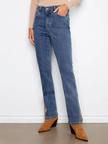 Step into fall in style with these medium blue bootcut jeans. Floral embroidery along the sides adds a touch of elegance to any outfit. With a regular rise and stretchy denim, they offer a comfortable fit, perfect for pairing with boots or heels. A chic addition to your everyday wardrobe.