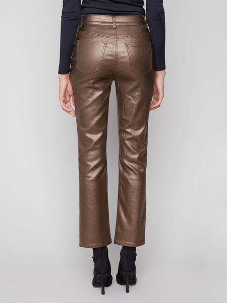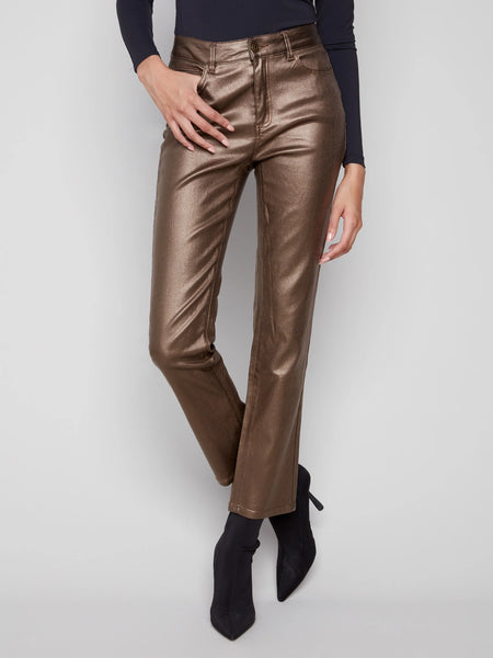 Turn heads with these striking slim leg pants in black, designed to make a bold statement. Featuring a sleek metallic wax finish, they exude a chic and edgy vibe, perfect for any nighttime outing or adding flair to your everyday style. These pants seamlessly blend fashion with versatility, making them a must-have in your fall wardrobe.