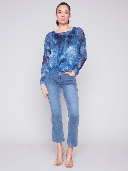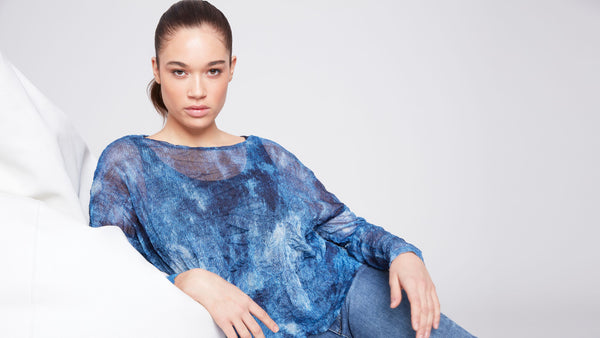 This relaxed top is perfect for any casual day out. It features a unique denim tie dye pattern on soft crinkle mesh fabric, giving it a stylish and comfortable look. Pair it with your favorite jeans for a complete and effortless outfit.
