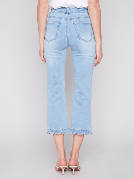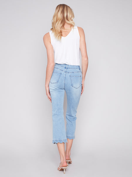 These Charlie B straight leg ankle jeans are a must-have for any wardrobe. The scalloped hem provides a unique touch, while the straight leg design flatters your figure. These jeans effortlessly transition from day to night, making them the perfect addition to any outfit.