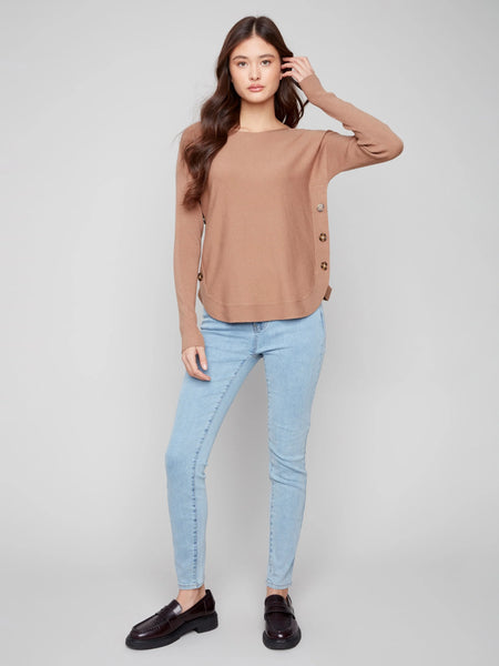Elevate your wardrobe with the Charlie B Boat Neck Sweater in Truffle. Featuring stylish side buttons and a flattering boat neckline, this cozy sweater combines comfort with chic detail—perfect for effortless everyday elegance.